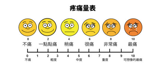 最左侧代表一点都不疼,最右侧代表无法忍受的疼。让病人自己选择,到底属于哪个程度。