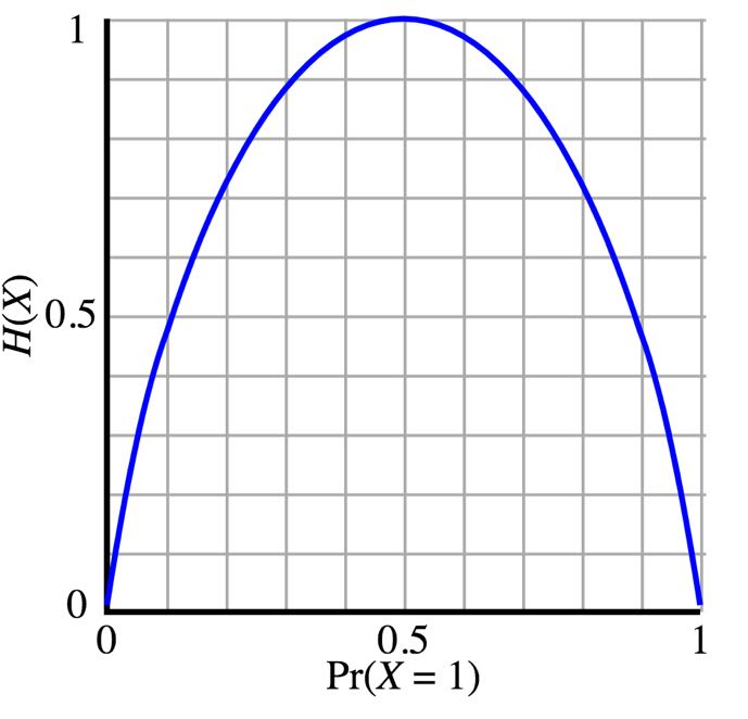 图中的横轴是A发生的概率,它从0到1分布,纵轴就是熵,也就是确定它发生,你需要的信息量。你会发现,当A发生的概率正好是1/2时需要的信息熵达到顶峰,是一比特。