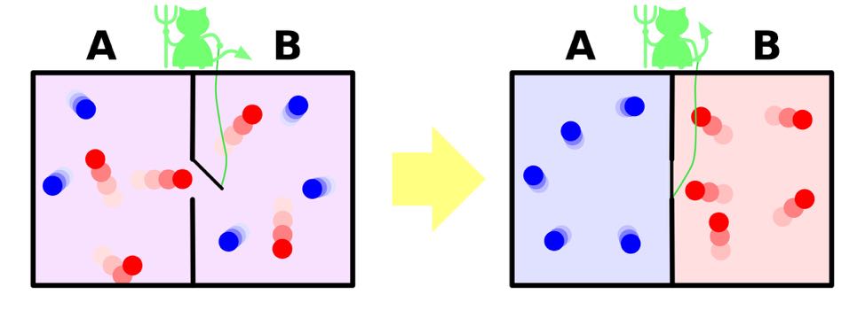 于是麦克斯韦就假想了一种情形。当两个联通的容器中冷、热空气混合,也就是熵比较大时,他在两个联通的容器之间安排了一个妖怪把门,这个妖怪能探测并控制单个分子的运动。
