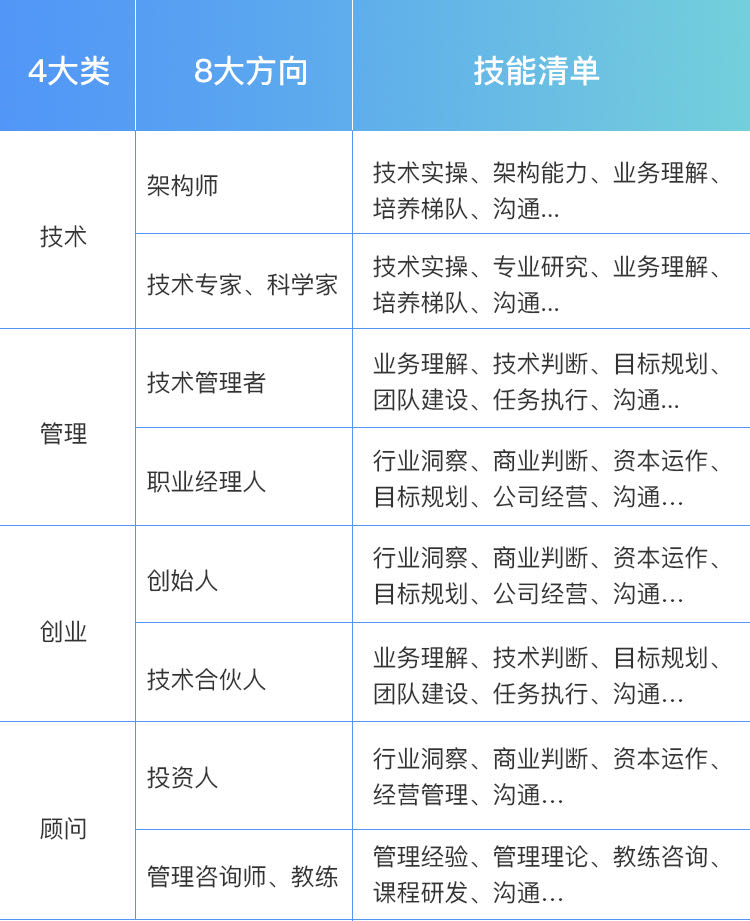 这四个大类分别是技术类、管理类、创业类和顾问类,接下来我逐个来详细说明。