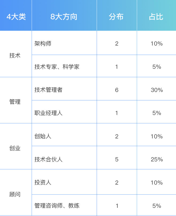 技术管理者和创业公司的技术合伙人相对集中,两个方向加起来超过一半。