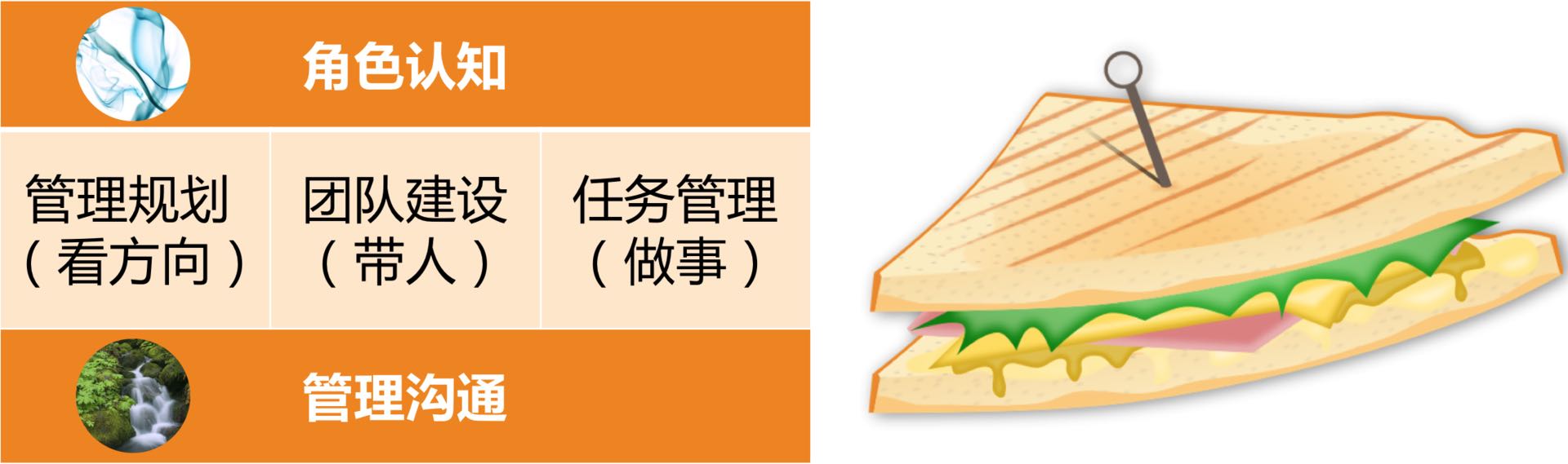 我们把无所不在的空气般的认知作为“天”,把承载一切管理工作的沟通作为“地”,把管理者需要做的看方向、带人、做事放在中间,就组成了管理者的管理框架,由于看上去像一块三明治,我把它形象地称为“管理三明治”。