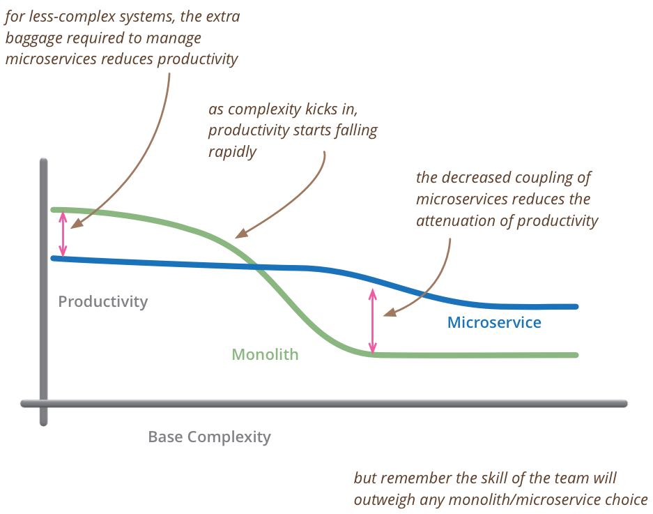 图的 X 轴代表了基本复杂度(Base Complexity),Y 轴代表了生产效率。我们可以看出,当一个公司规模很小的时候,基本复杂度相对较小,所以单一代码库(Monolith)的效率就会高。