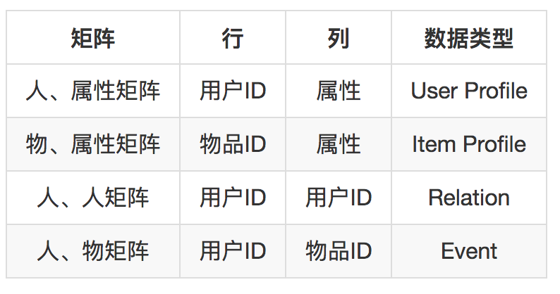 我总结了推荐系统需要四种矩阵,对应四种数据,列表如下:
