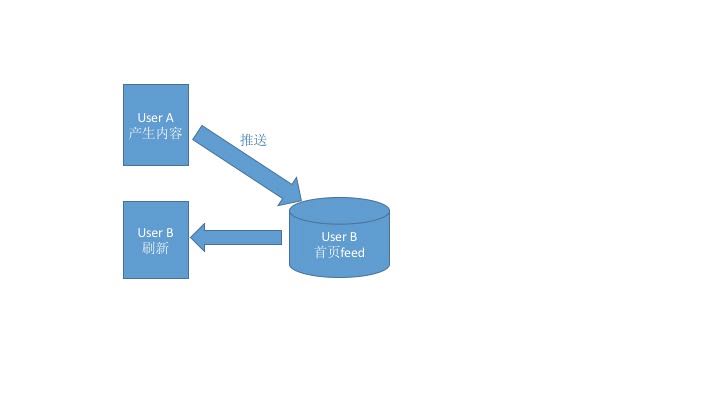 当一个Actor产生了一条Activity后,不管受众在不在线,刷没刷新,都会立即将这条内容推送给相应的用户(即和这个Actor建立了连接的人),系统为每一个用户单独开辟一个信息流存储区域,用于接收推送的内容。如此一来,当用户登录后,系统只需要读取他自己的信息流即可。
