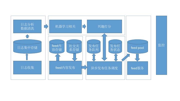 这张架构图划分成几个大的模块:日志收集、内容发布、机器学习、信息流服务、监控。这里分别介绍一下: