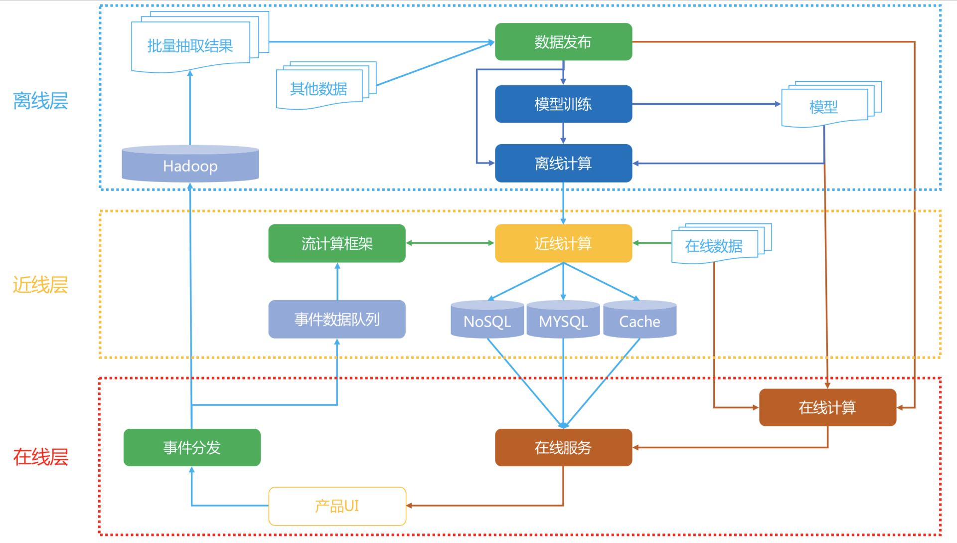 我先整体看一下这个架构,一共分成三层:在线、近线、离线。