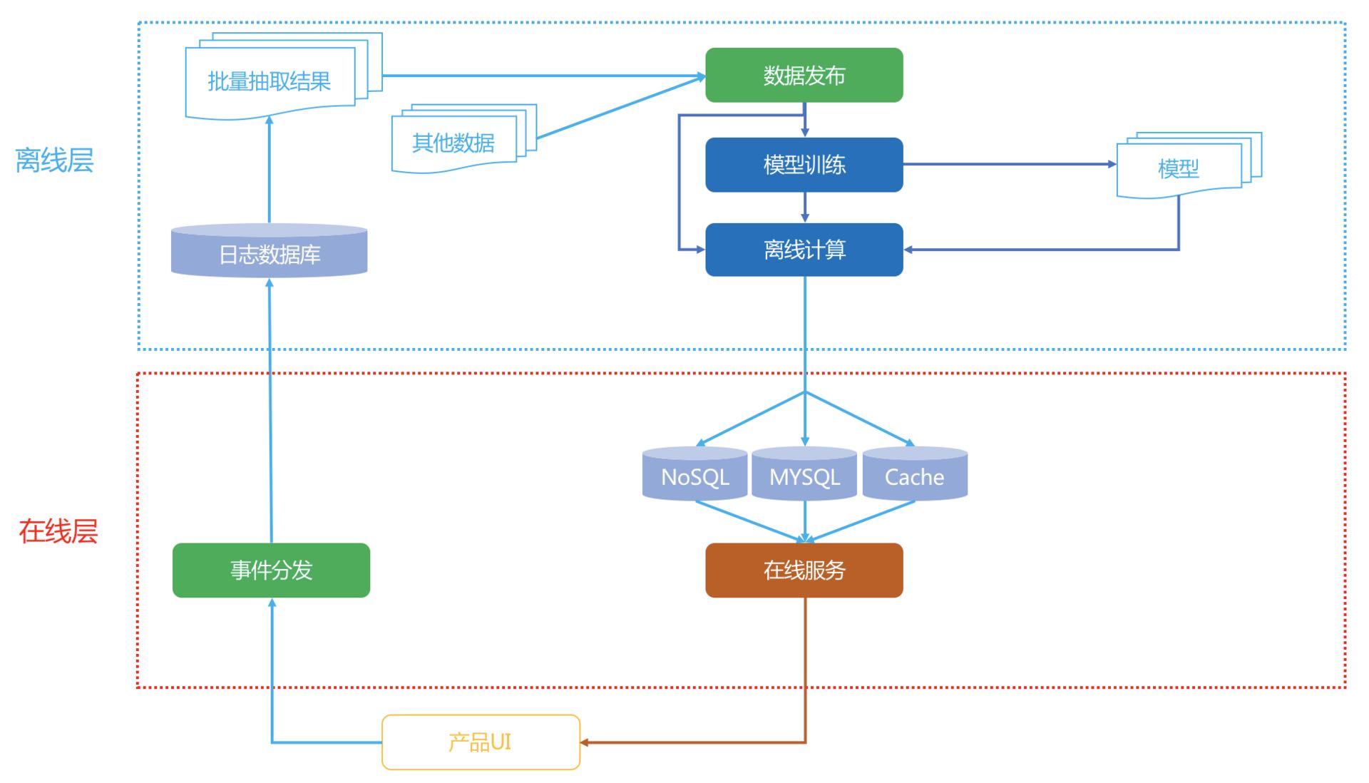 用户在产品UI上使用产品,消费展示的内容,产生行为事件数据,实时地被收集走,一边进入分布式的文件系统中存储,供离线阶段使用,另一边流向近线层的消息队列,供近线阶段的流计算使用。