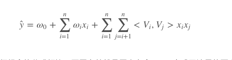 $$\hat{y} = \omega_{0} + \sum_{i=1}^{n}{\omega_{i}x_{i}} + \sum_{i=1}^{n}{\sum_{j=i+1}^{n}{<V_{i}, V_{j}>x_{i}x_{j}}}$$