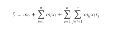 $$\hat{y} = \omega_{0} + \sum_{i=1}^{n}{\omega_{i}x_{i}} + \sum_{i=1}^{n}{\sum_{j=i+1}^{n}{\omega_{ij}x_{i}x_{j}}}$$