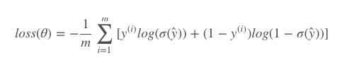 $$ loss(\theta)= -\frac{1}{m}\sum_{i=1}^{m}{[y^{(i)}log(\sigma(\hat{y}))+(1-y^{(i)})log(1-\sigma(\hat{y}))]} $$