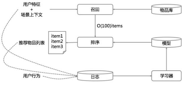 一个典型的推荐系统架构,其实很类似一个搜索引擎,搜索由检索和排序构成。推荐系统也有召回和排序两部构成,不过,推荐系统的检索过程并不一定有显式的检索语句,通常是拿着用户特征和场景特征去检索召回,其中用户特征也就是在前面的专栏中提到的用户画像。
