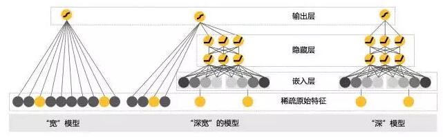 我来解释一下这个示意图,这个示意图有三部分。最左边是宽模型,中间是深宽模型,最右边是纯的深度模型。