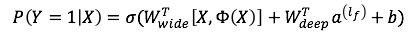 其中,Y是我们要预估的行为,二值变量,如购买,或点击,Google的应用场景为“是否安装APP”。σ是sigmoid函数,$W_wide^T $宽模型的权重,Φ(X)是宽模型的组合特征,$W_deep^T $应用在深模型输出上的权重,$a^(l_f ) $是深模型的最后一层输出,b是线性模型的偏置。