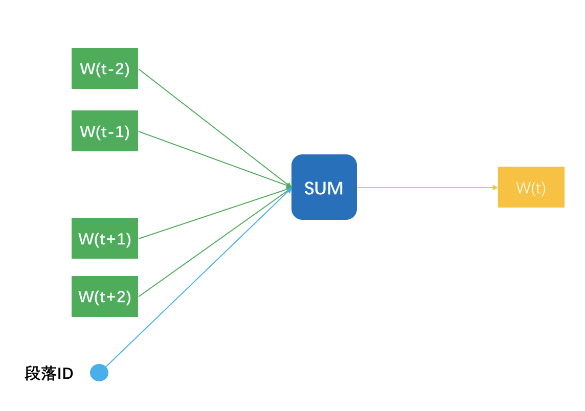 一个段落中有多少个滑动窗口,就得到多少条关于段落ID的样本,相当于这个段落中,段落ID在共享嵌入向量。段落ID像个特殊的词一样,也得到属于自己的嵌入向量,也就是Doc2vec。