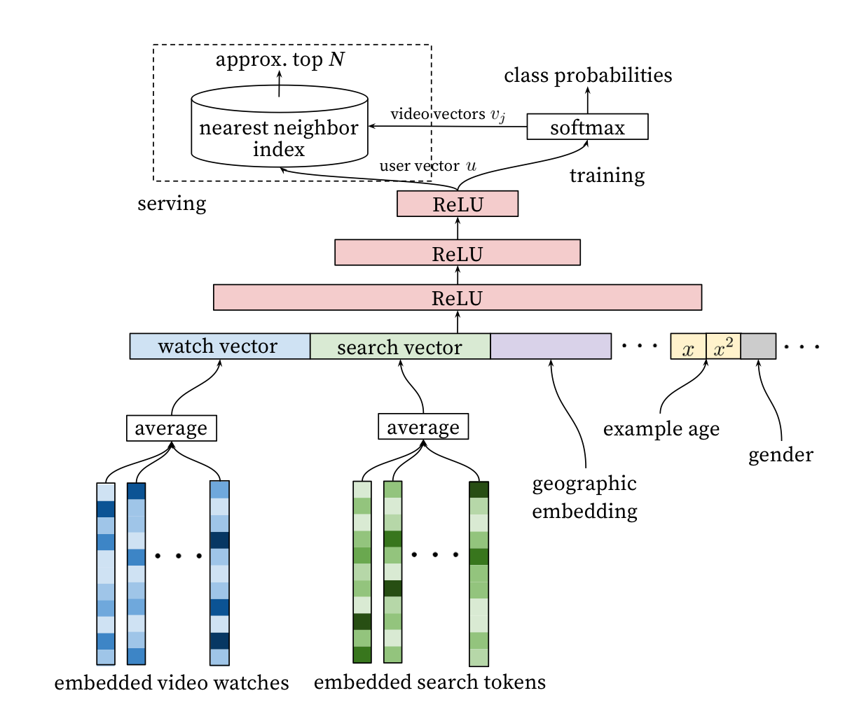 所有这些不同的嵌入向量拼接成一个大的输入向量,经过深度神经网络,在输出层以Softmax作为输出函数,预测下一个观看视频。