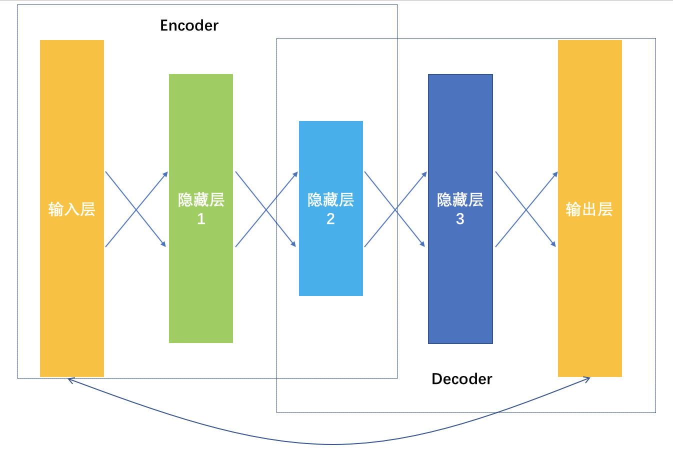 从输入数据逐层降维,相当于是一个对原始数据的编码过程,到最低维度那一层后开始逐层增加神经元,相当于是一个解码过程,解码输出要和原始数据越接近越好,相当于在大幅度压缩原始特征空间的前提下,压缩损失越小越好。