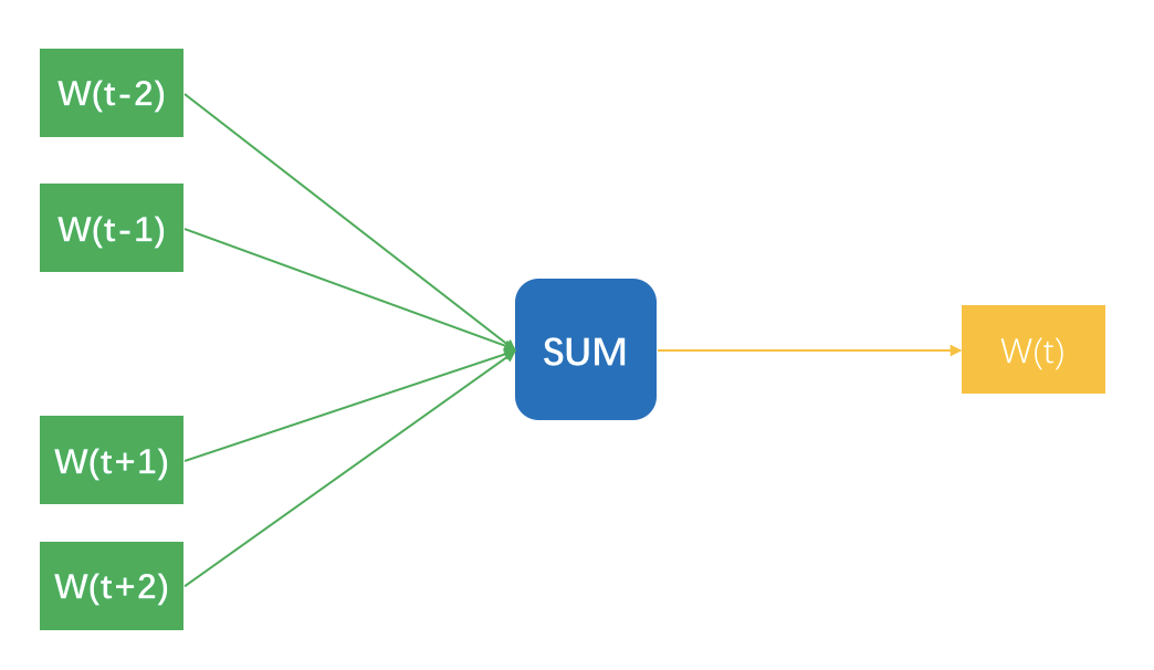 每条样本都是用窗口内一个词去预测窗口正中央那个词,明明窗口内是N个词,为什么只有N-1条样本呢?因为正中央那个词不用预测它本身啊。这N-1条样本的输入特征是词的嵌入向量,预测标签是窗口那个词。示意图如下所示。