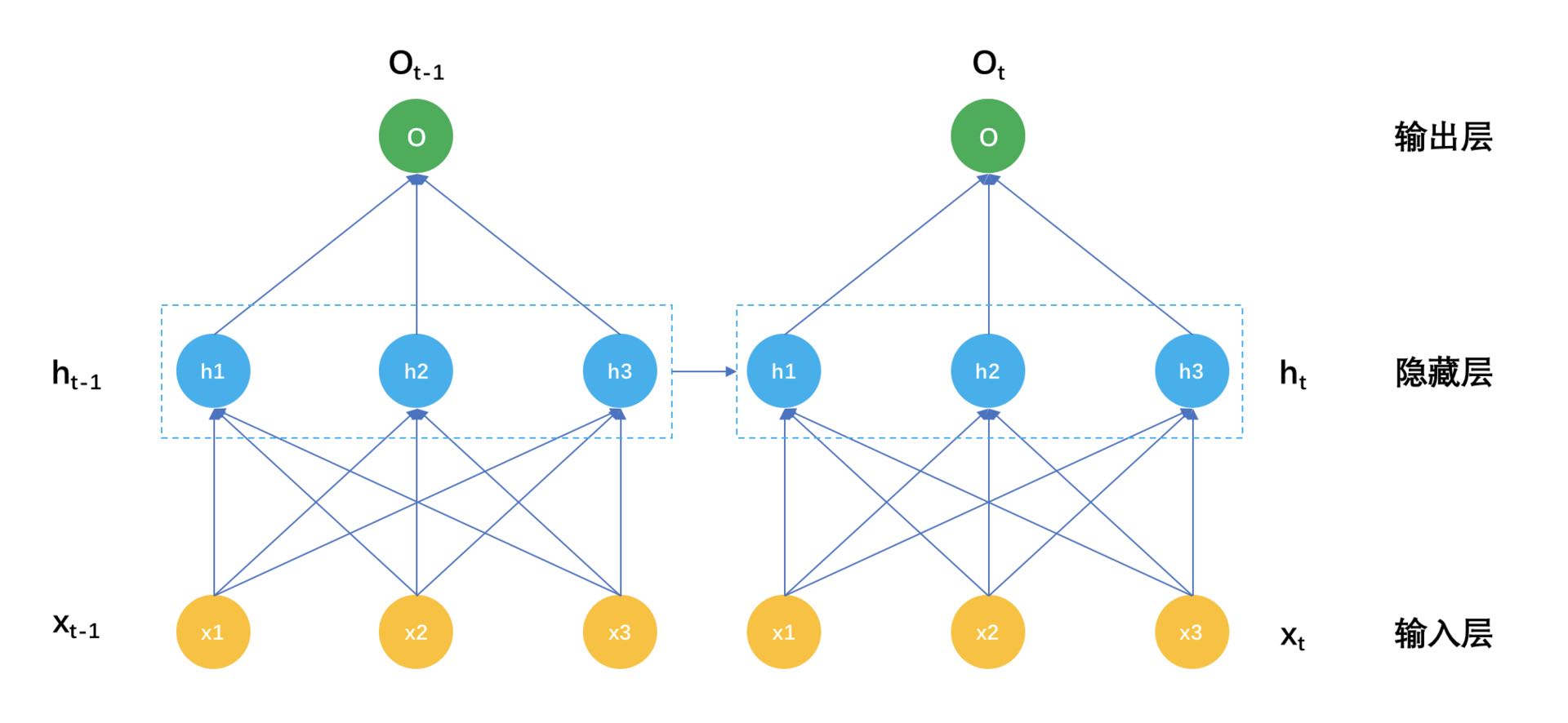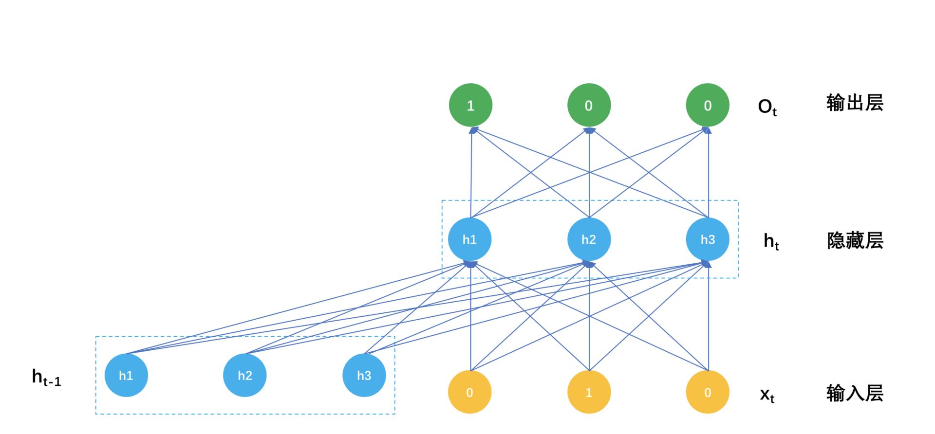 除此之外,每一个隐藏层神经元还依赖上一个时刻自己的输出值,隐藏层神经元是k个,一个k维向量。