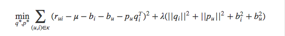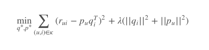 $$ \min_{q^{* },p^{* } } \sum_{(u,i) \in \kappa }{(r_{ui} - p_{u}q_{i}^{T})^{2} + \lambda (||q_{i}||^{2} + ||p_{u}||^{2})} $$