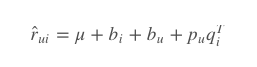 $$\hat{r}_{ui} = \mu + b_{i} + b_{u} + p_{u}q_{i}^{T} $$