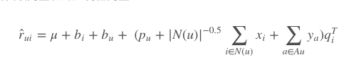 (p_{u} + |N(u)|^{-0.5}\sum_{i\in{N(u)}}{x_{i}} + \sum_{a\in{A{u}}}{y_{a}})q_{i}^{T} $$