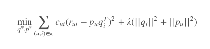 $$ \min_{q^{* },p^{* } } \sum_{(u,i) \in \kappa }{c_{ui}(r_{ui} - p_{u}q_{i}^{T})^{2} + \lambda (||q_{i}||^{2} + ||p_{u}||^{2})} $$