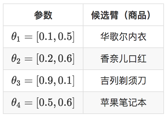 $x_{i}\times\theta_{j}$,这就是给男性用户推荐剃须刀,给女性用户推荐口红,即使是新用户,也可以作出比随机猜测好的推荐,再观察用户是否会点击,用点击信息去更新那个被推荐了的候选臂的参数。