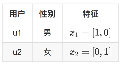还是举个例子,假设现在两个用户,用户有一个特征就是性别,性别特征有两个维度,男,女。现在有四个商品要推荐给这两个用户,示意如下。