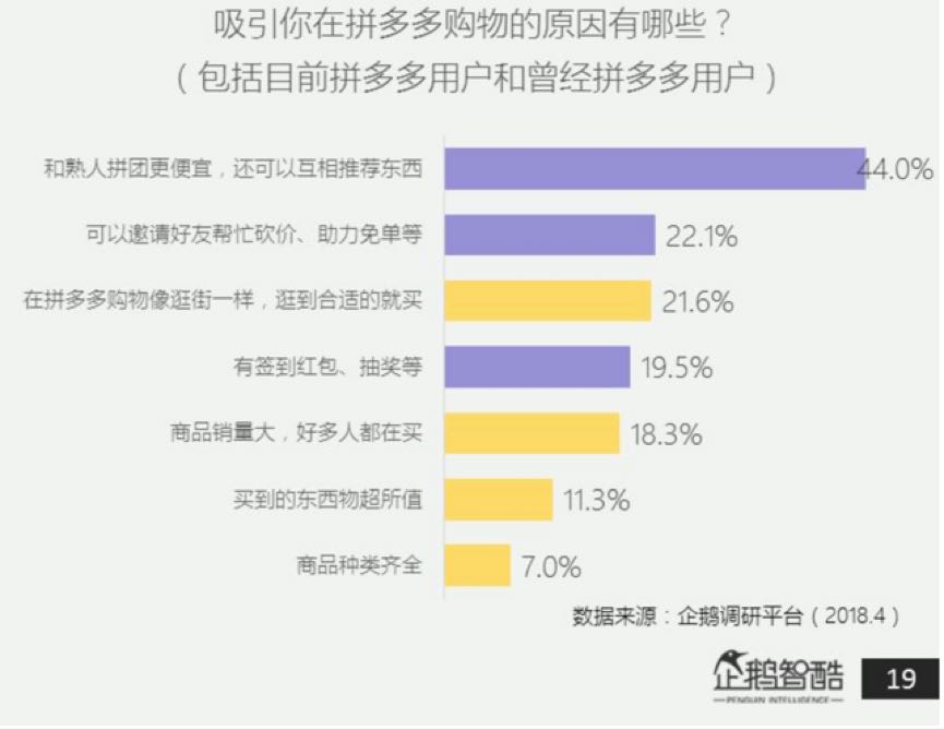 在用户选择在拼多多购物的原因中,有44%认为是跟熟人拼团更容易。这意味着用户不知道想要什么,但我想吃水果,到底吃什么呢,被人拉我拼哪个,我就吃哪个,这就是典型的笨笨用户。