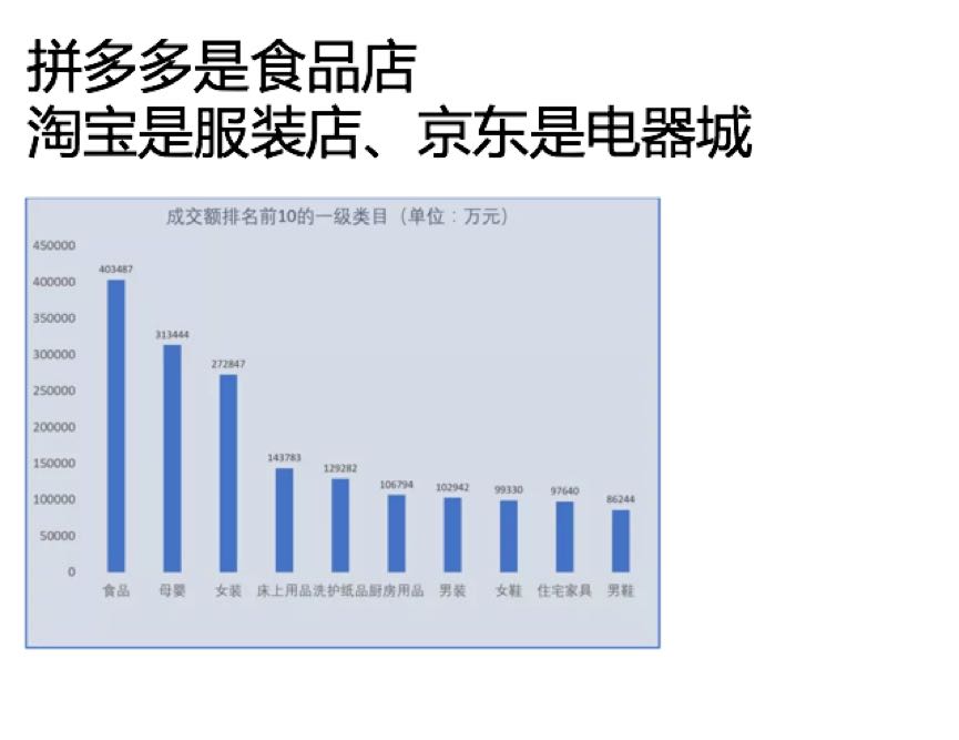 在拼多多排名前十的类目中,排到第一的类目是食品。而淘宝排第一的是服装,具体而言是女装。京东是卖3C产品,接着扩展到家电,现在又扩展到更多品类。