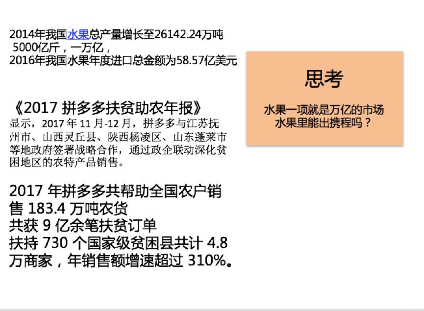 我找到一份2017年拼多多的扶贫助农年报。2017年,拼多多扶持一批贫困县,做了帮助全国农户销售了183万吨农货,支持了9亿笔扶贫订单,扶持了730个国家级贫困县,共4.8万个商家,年销售额增长突破了300%。