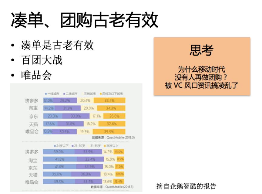 那我们再思考一个问题,实物团购的模式明明已经被验证过了,为什么突然之间整个场子里没有人再做这个生意,而只剩下拼多多做了?
