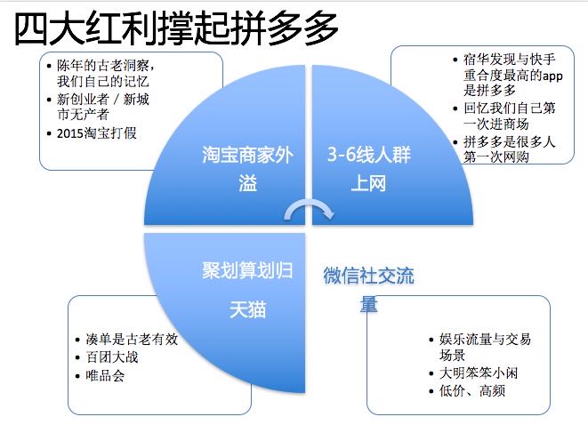 当然,不是仅仅这简单的几件事形成了拼多多,具体来说是四大红利板块撑起了拼多多。