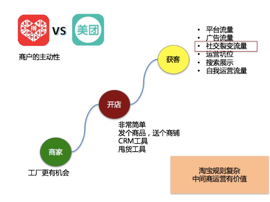 当拼多多再成体量地获取商家时,已经不需要经历这么艰难的扫盲过程了,这些人已经被阿里、美团的地推普及过无数遍了。