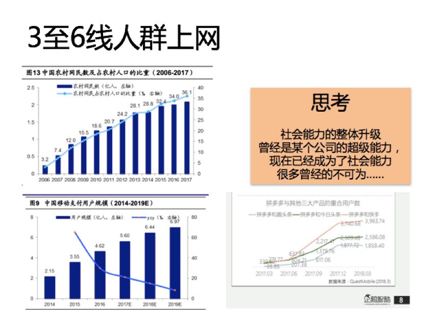 新用户的出现,是由红米为代表的低价智能手机普及,快速让三到六线用户上了网,农村互联网的渗透率提升。