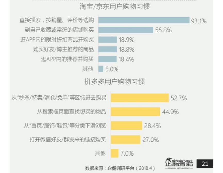 第三个值得关注的数据:淘宝和京东的购物习惯,93.1%来自直接搜索,再按照销量和评价来选购。拼多多则是从秒杀、特卖、清单、免单的区域去购买,这就是典型的大明用户和笨笨用户的区别: