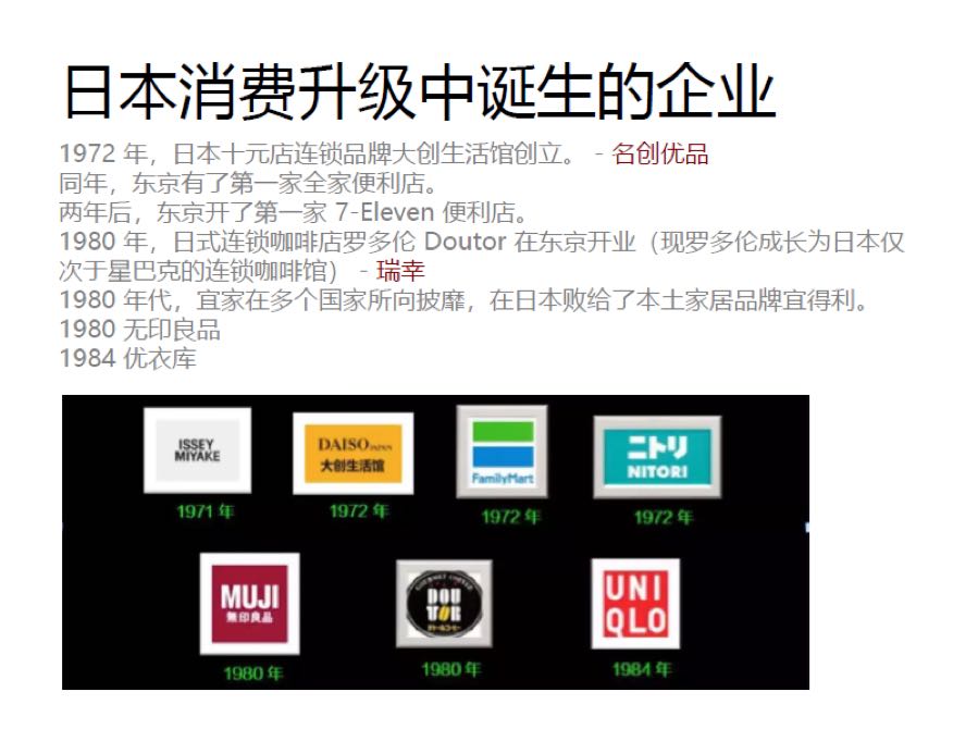 日本的消费升级持续了20年,在这20年的时间里其实是诞生了一系列,今天我们看来非常强的产业,或者应该是40年前日本消费升级的结果。