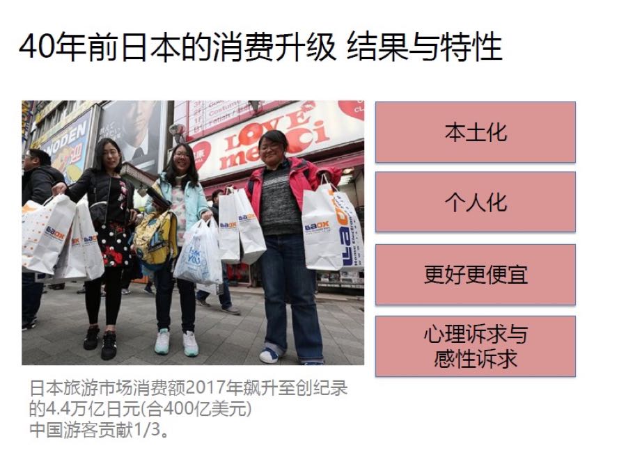 我们处在一个消费升级的时代,在这个时代,不管是20年代美国的消费升级,还是20世纪70年代日本的消费升级,都崛起了美国的本土品牌和日本的本土品牌,并且它利用了本土消费力,在本土做活以后,就向全世界开疆拓土一样。所以,其实下面我们中国也会面临这样一个时代。