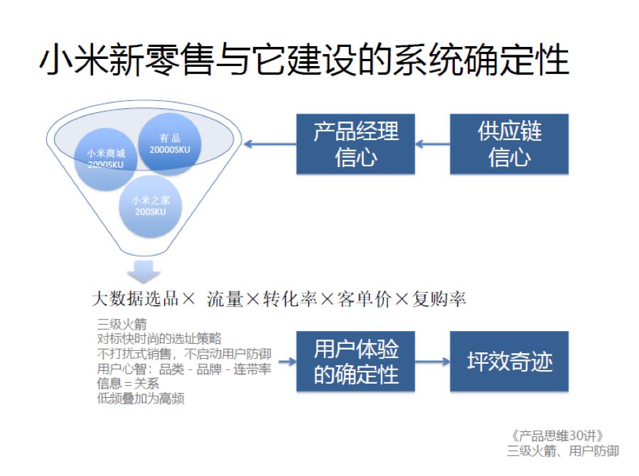 小米从有品的20000个SKU,向小米商城2000个SKU,再到小米之家的200个SKU,中间有大数据选品、流量运营、转化率、客单价、复购率的持续运营,能给到的是产品和供应链足够的信心。产品只要好,我能够快速在第一时间线上线下所有渠道到达,一切功夫一定不会白费。