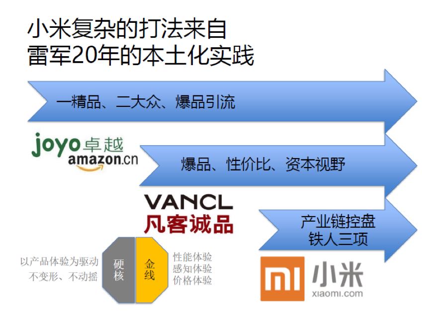 所以这个时候你会发现,小米的特性其实是从卓越精品店的时代到凡客、优衣库的SPA的策略,以及亚马逊的A9所有的经验加在一起,又加了雷军特性的驾驭互联网流量的粉丝经济策略。