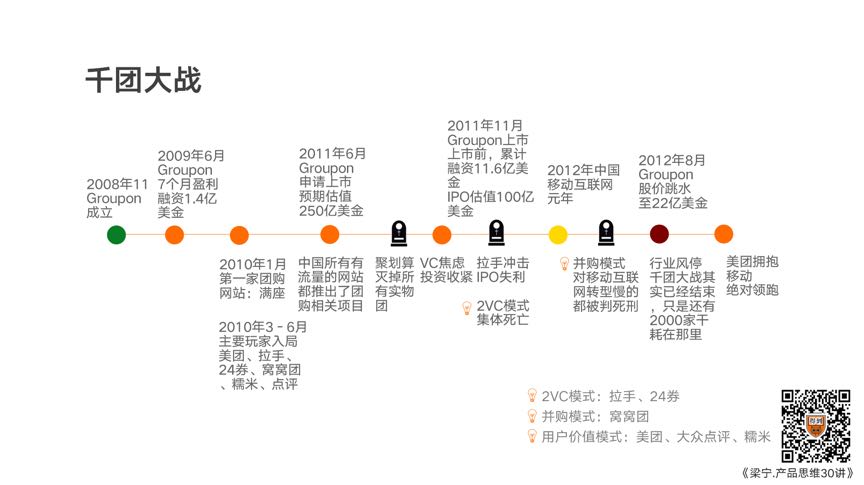 上面两种模式,2VC的创业者被VC抛弃了,出局;没能拥抱移动互联网的,被闪腰了。所以,直到2012年团购的风口关了,美团开始领跑这个板块。