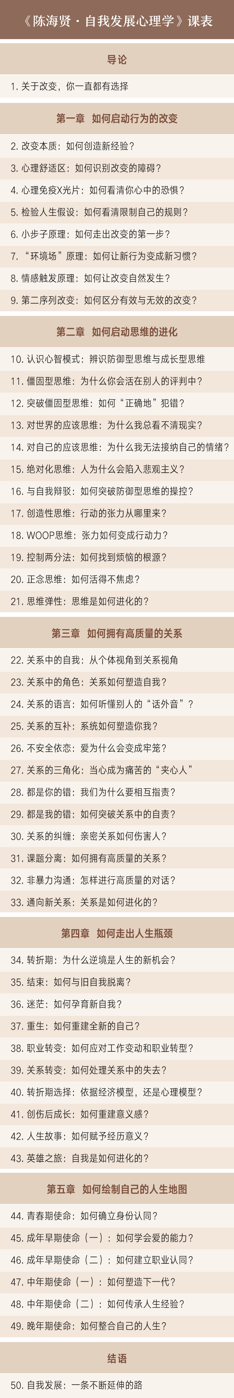 我将用50讲的时间,系统回答上面这一系列问题。我希望这门课提供的思维方法和行动工具,能够帮助你迈开改变的步伐,突破或大或小的人生困境,创造一个让自己更满意的人生。