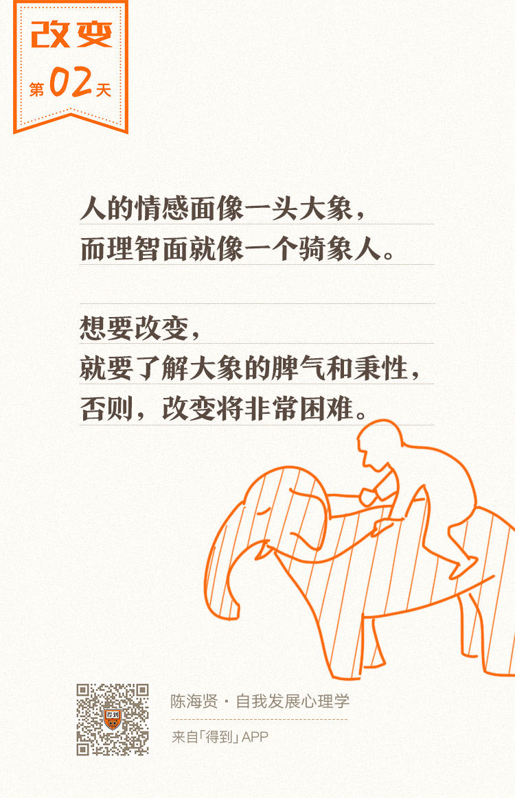 如果你的理性想要改变,就需要了解感性大象的脾气和秉性,利用大象的特点,这样才能事半功倍。否则,改变将非常困难。