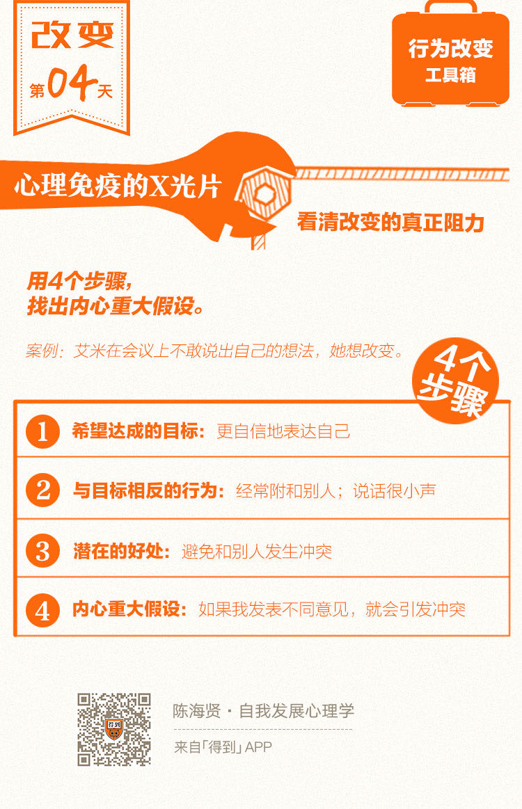回忆一下,今天我们讲了心理免疫系统的X光片,它提供了一个清晰的工具,把情绪这头大象的语言翻译成了骑象人能听懂的语言,让我们看到,到底是什么阻碍我们改变。