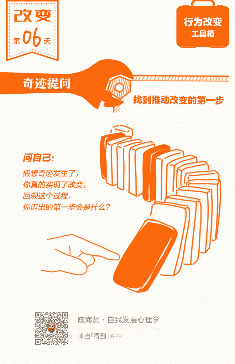 用“奇迹提问”的方法,找到第一个小小的改变,并让它实现,这种策略就叫做“小步子原理”。
