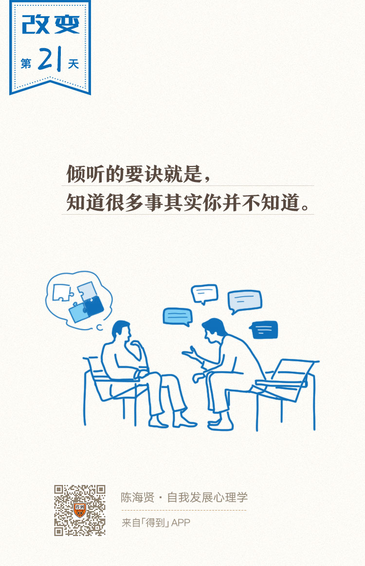 我点点头说知道了,而我心里想的是,老师只是提醒我一个我早就知道的常识罢了。那时候我对倾听的理解,还停留在不能只顾自己喋喋不休地讲,不能别人没说完就抢别人的话说,要有耐心这一个层次。我心里说,我是一个温和的人,我愿意倾听,倾听是我的强项。