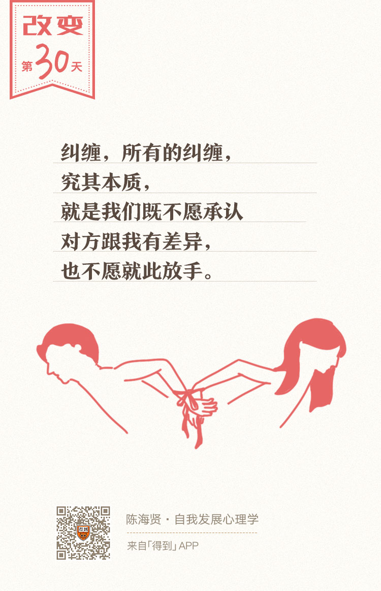 所有的纠缠,究其本质,就是既不愿承认对方跟我们有差异,也不愿就此放手。既不愿意承认我们满足不了对方的期待,也不愿意承认对方满足不了我们的期待,而把彼此改造成自己想要的样子,并因为改造失败而责怪对方不配合我们自己。