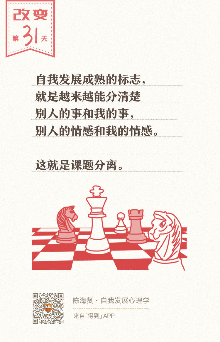 而自我发展成熟的标志,就是越来越能分清楚别人的事和我的事,别人的情感和我的情感。自我的边界,就是通过这种区分确立起来的。这就是课题分离。