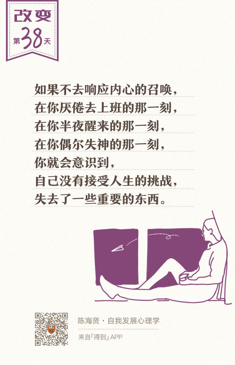 可是,如果不去响应内心的召唤,在你厌倦却不得不去上班的那一刻,在你半夜醒来的那一刻,在你偶尔失神的那一刻,你就会意识到,自己因为没有接受人生的挑战,而失去了一些重要的东西。
